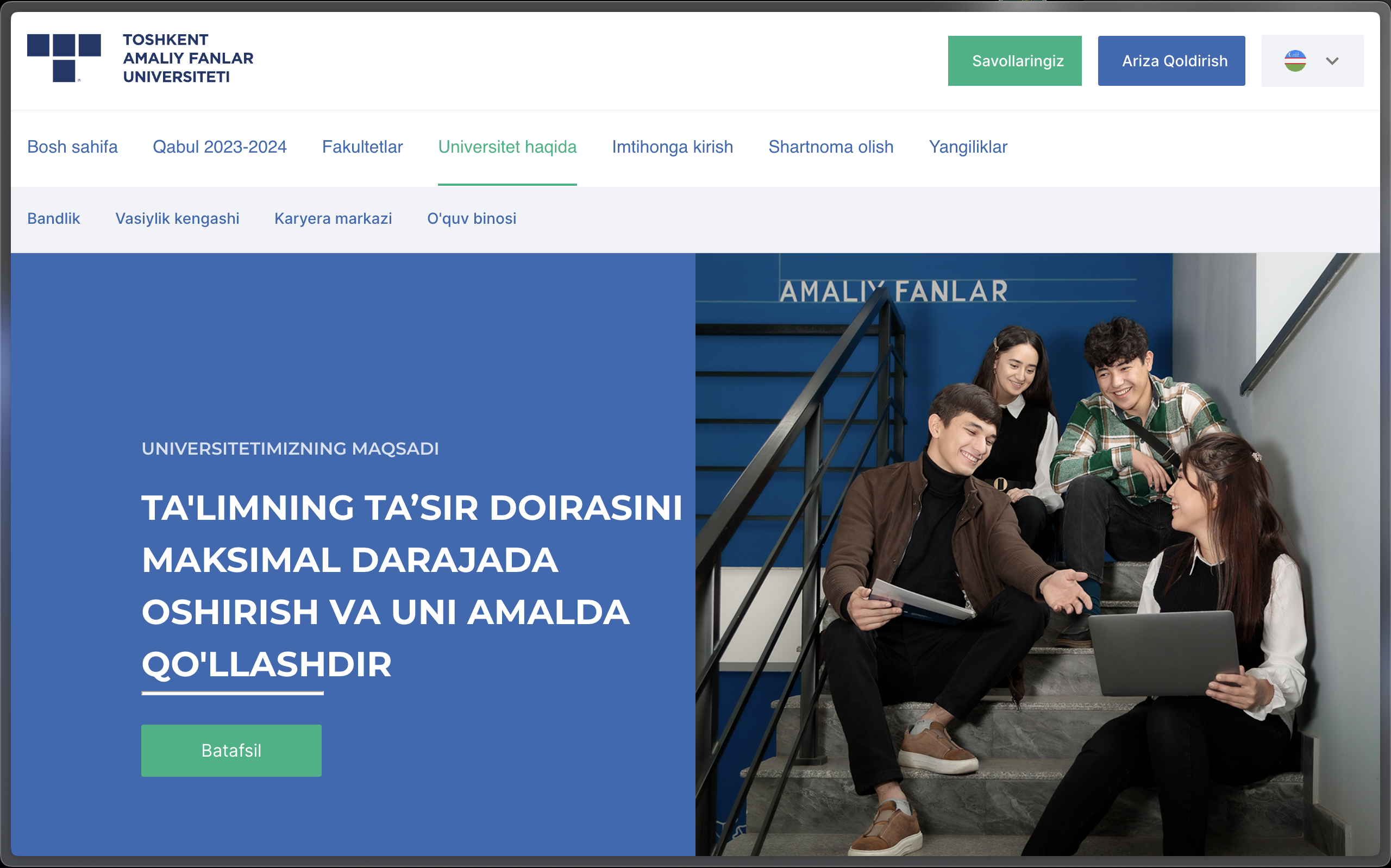 Utas.uz is a comprehensive university website and admin panel designed to streamline the admission process. The project includes a public-facing website where prospective students can learn about the university, its programs, and apply for admission. It also features an admin panel for university staff to manage applications, review submissions, and oversee the admission process efficiently.